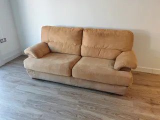 Cómodo sofá de tres plazas con un diseño moderno. - Tapicería anti manchas - Tono beige mostaza - En muy buen estado Guardado en un garaje en planta baja muy fácil de recoger.