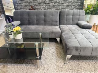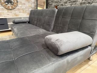 Sofá cama de terciopelo en color gris. Un mueble versátil y cómodo para tu hogar. - Diseño moderno con capitoné. - Incluye cojines. - Patas metálicas.