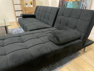 Sofá cama con chaise longue en color negro. Un mueble versátil para tu salón. - Tapicería de terciopelo. - Estructura metálica. - Diseño moderno y funcional.