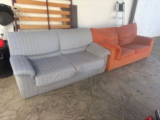 Conjunto de dos sofás de 3 plazas, uno en color gris y otro en color naranja. - Sofá de 3 plazas en tela gris. - Sofá de 3 plazas en tela naranja. El naranja mide 190 cms. de largo y el gris 170 cms. Están usados pero aun pueden valer para casa de alquiler o de playa. Los dejo en 30 euros cada uno por separado o 50 los dos. Hay que venir a recogerlos pero se pueden cargar cómodamente ya que están a pie de coche en garaje privado dentro de vivienda.