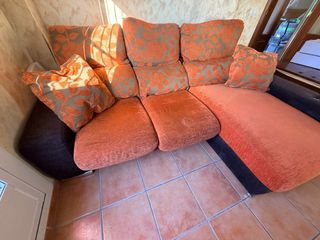 Sofá de tela en color naranja, 3 plazas amplias (aunque caben 4 o más personas cómodamente) se pueden sacar las dos plazas tipo sofá cama. Amplio chaise longe para almacenar. En buen estado, muy cómodo, con respaldo alto y reclinable.