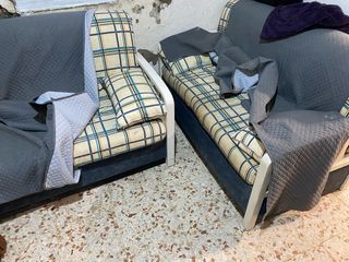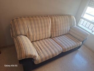 Conjunto de sofás de dos y tres plazas. Desperfectos y desgaste como se ve en la foto. Ancho 170 el de dos plazas y 208 el de tres. Altura 94 con los cocines. A recoger en persona.