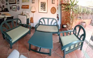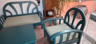 Conjunto de muebles de exterior para jardín o terraza. Incluye un sofá, dos sillones y una mesa auxiliar. Tienen algunos años pero están bien. La mesa está un poco tocada de una esquina. No se puede poner mucho peso. Les hice cojines estampados extras para que fuera más cómodo Uno de los cojines originales está roto, pero no se ve si lo pones hacia atrás. Medidas Sofá 128x62x77 Sillones 64x62x77 Mesa 58x92x43 Se pueden desmontar fácilmente