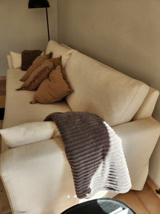 Sofá de 3 plazas NUEVO A ESTRENAR, estilo nórdico en color beige y blanco. 📏 Medidas: 193 x 75 x 79 cm 🛋️ Asiento muy cómodo con 3 capas de espuma (densidades 28, 18 y 22 kg/m³) 🧸 Incluye 3 cojines grandes de respaldo + 2 cojines pequeños 🪵 Estructura de madera y tapizado en tela Se compró para un shooting que finalmente no se realizó, por lo que está sin uso, por montar y completamente nuevo. Montaje fácil y rápido. 💰 Precio original: 500 € 👉 Precio: 370 € 📍 Recogida en Sant Quintí de Mediona o enviamos de por 50€ de forma particular.