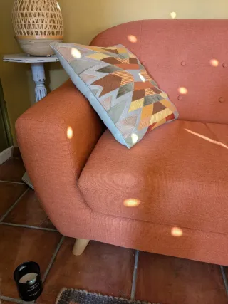 Sofá de Sklum con un diseño estilo nórdico. Color naranja, teja, muy chulo. Patas de madera clara. En muy buen estado, solo tiene unas ligeras manchitas apenas visibles. - Tapicería de tela. - Estructura de madera.