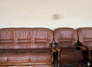 Conjunto de sofá de tres plazas y dos sillones individuales. El diseño combina la calidez de la madera con la elegancia del cuero. - Sofá de 3 plazas. - Dos sillones individuales. - Estructura de madera. - Tapicería de cuero.