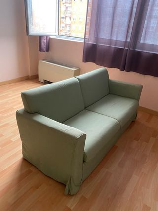 Sofá cama de Ikea de 2 metros, trillado pero funcional y además bastante cómodo para dormir. Apertura tipo libro.