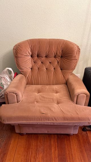 Este sillón de tela ofrece un diseño acogedor y confortable para tu hogar. - Tapicería suave al tacto. - Patas bajas para mayor estabilidad. - Respaldo alto con capitoné. Pequeña rotura en la parte de abajo, se aprecia en las fotos. Transporte por parte del comprador.