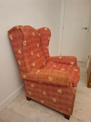Butaca de tela en tonos rosas con un bonito estampado. - Nunca utilizada, solo se ha usado para dejar ropa encima. - Estructura de madera.