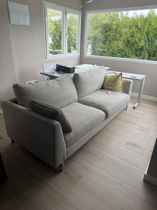 Sofá cama de dos plazas con un diseño moderno y elegante. Su tapicería es muy agradable al tacto. No tiene ni un año, lo compramos nuevo y no le hemos dado a penas uso - Estructura robusta. - Cojines cómodos. - Patas discretas.