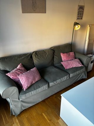 Sofá de tres plazas en perfecto estado, con menos de un año de uso. Fácilmente extraible los cojines para lavar. Se vende por mudanza a casa que ya tiene sofá. - Tapicería de tela. - NO Incluye cojines.