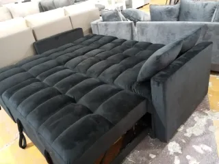 Sofá cama de terciopelo en color negro. Un mueble versátil y elegante para tu hogar. - Diseño moderno y acolchado. - Incluye cojines decorativos. Arcón de almacenaje Medida 210 x 155 cm Medida Cama 160 x 190 Pago Contrareembolso Envío de 3 a 7 días hábiles
