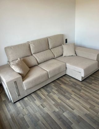 Sofá chaise longue de tela color beige en perfecto estado. Es cómodo y espacioso, ideal para relajarse. - Tres plazas amplias. - Incluye dos cojines. - Diseño moderno y elegante. - Tapizado de tela suave.