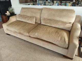 Sofá de tres plazas con un diseño elegante y confortable. Posibilidad de transporte - Tapicería de terciopelo. - Tonos beige y marrón.