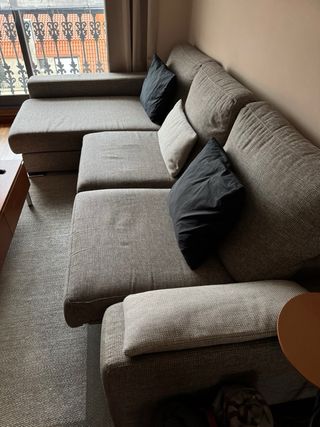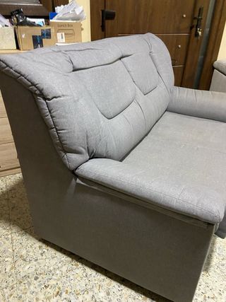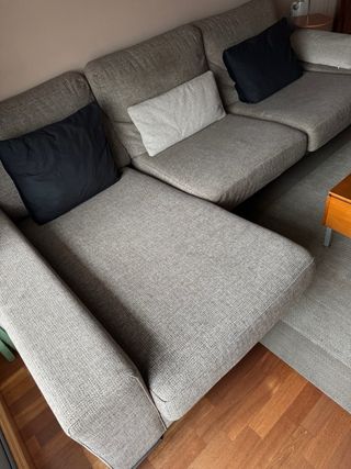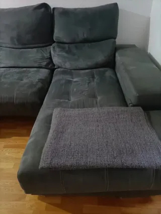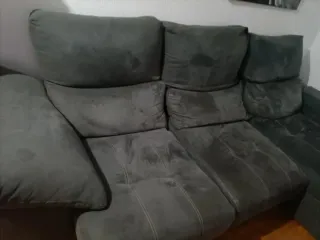 Sofá de tela gris con chaiselongue. - Diseño moderno. - Acolchado confortable. -Cabezales reclinables. -Asientos deslizantes. -Amplio y cómodo. En los asientos le faltan trocitos de tela, nosotros le teníamos una colcha, pero con una funda queda perfecto. Gracias.