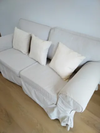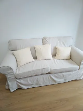 Sofá de 2 plazas de IKEA con un diseño moderno y cómodo. Su tapicería es de tela y su color beige lo hace muy versátil. - Funda extraíble para facilitar la limpieza. Fundas lavadas, aunque tiene alguna manchita que no ha salido en el lavado normal (Ver últimas fotos) . Cojines también desenfundables para lavado. Fundas en tela algodon/Poliester. - Cojines incluidos (3). De regalo ⛔ NO SE ENVÍA. RECOGER ZONA TEIS