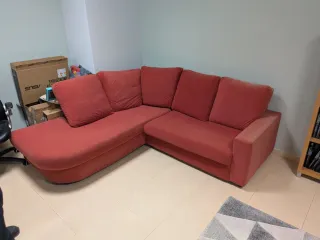 Sofá modular de tela en color rojo, perfecto para tu salón. Cuenta con una chaise longue para mayor comodidad. - Diseño en L. - Tapicería de tela. - Color rojo intenso. Se divide en 2 partes. La tela tiene algo de desgaste normal de uso y sol. Entrega en mano en Mos