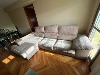 Cómodo sofá de tres plazas con chaiselongue, perfecto para tu salón. El comprador tiene que recogerlo en Teis. PRECIO NEGOCIABLE, urge venta - Tapicería de tela. - Color beige y marrón.