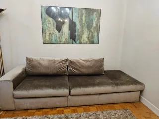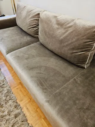 Urge. Está nuevo, en perfectas condiciones, sin estrenar, estuvo forrado. Costo 360 euros. Este sofá cama combina un diseño moderno con comodidad. - Tapicería de tela terciopelada y brillo. - Estructura metálica con patas decorativas en inox. Espuma de alta densidad y comodidad. Mide 80 de alto, 92 de fondo y 180 de largo. Y abierto mide de ancho 110. Por 180 de largo . Sofá en perfecto estado y fácil de transportar. Nada de uso. Esta en perfectas condiciones.