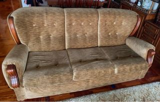 Sofá de tres plazas con un diseño clásico y elegante. Tapizado en tela de color marrón con un patrón sutil. - Estructura con detalles de madera en los brazos y el respaldo. - Tres asientos individuales. - Respaldo con botones decorativos. Largo 190 cm aprox Se venden con dos sillones a juegos por 50€ cada uno. Hago precio por todo el conjunto.