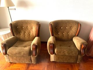 Conjunto de dos sillones con un diseño clásico y elegante. - Tapicería en tela con detalles de madera. - Tonos beige y marrón que combinan fácilmente. Cada sofá 50€
