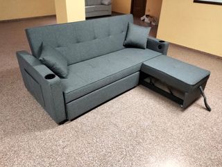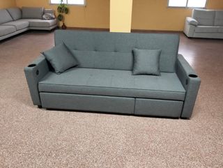 Sofá cama de tela en color gris. Es un mueble versátil que puede adaptarse a diferentes espacios. Nuevo a estrenar Posibilidad de envio a toda España - Diseño moderno. - Incluye cojines. - Reposabrazos con portavasos. - Bolsillo en lateral Oportunidades en mi perfil