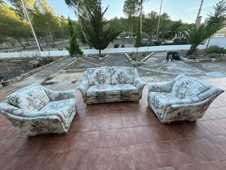 Sofás de tres y dos plazas con un diseño clásico. Cogines y asientos tapizados removibles, en buen estado, limpios y sin marcas de uso. - Tapicería en tela con estampado floral de color sufrido. - Estructura de madera resistente. - Incluye cojines decorativos a juego. Preferiblemente se venden juntos. Por separado 50€ el de 3 plazas y 30€ el de dos plazas.
