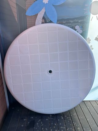 Base redonda y pesada para sombrilla, ideal para colocar en balcones o terrazas. Fabricada en hormigón o material similar, con un tubo central para insertar el mástil de la sombrilla. - Color: Blanco roto con motas grises. - Material: Hormigón o similar. - Forma: Redonda. - Incluye tornillo de sujeción.