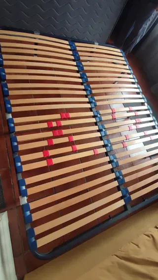 Somier de láminas para cama de matrimonio. - Estructura metálica resistente. - Láminas de madera. - Color negro y marrón. -Una lámina está estropeada, se puede cambiar