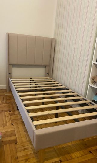 Oferta cama somier + cabecero Cabecero de madera en un color cálido muy bonito. Somier de cama individual de 90 cm: 90 cm ancho, 2.00 cm largo, 37 cm alto. - Estructura de metal, y láminas de madera. - Diseño con cintas de sujeción. Se puede ver sin compromiso en Yamaguchi, san Juan .