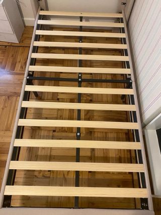 Estructura de cama de 90x190 cm. en buen estado. Se incluye la base tapizada de listones de madera y la cabecera. - Perfecta para colchón de 90x190 cm. - Listones de madera maciza. - Cabecera de madera con un diseño sencillo y elegante.