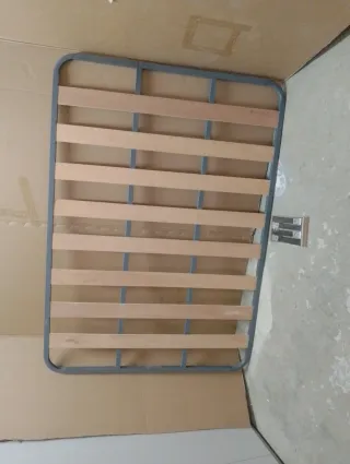 Somier de láminas de madera con estructura metálica. Cómo se puede observar en la foto , aún está en su empaque porque al final no lo usamos. Es para recoger en Alcorcón central. - Medidas 180x90 cm. - Color de la estructura: negro. - Color de las láminas: madera natural.