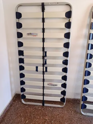 Somier de láminas de la marca FIBERMASTER. Vendo dos, de medidas 1,82× 0,90. NO TIENE PATAS. - Estructura principal de metal. - Láminas de madera. - Soportes de plástico.