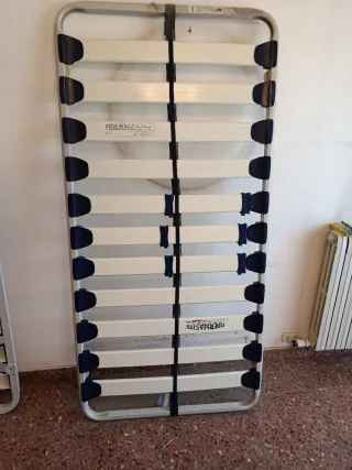 Somier de láminas de madera con estructura metálica en buen estado. - Medidas: 90x190 cm. - Patas desmontables para facilitar el transporte y almacenamiento.