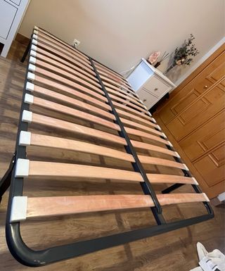 Somier de láminas de madera con estructura metálica, ideal para bases de cama. Se vende sin patas. - Láminas de madera de haya. - Estructura metálica resistente. - Diseño moderno y funcional. No se ha estrenado NUNCA, está impoluto