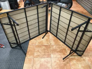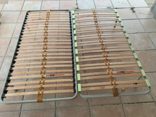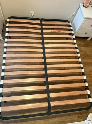 Somier doble de lamas de madera, en perfecto estado. Preferiblemente recogida en mano en Cuarte de Huerva. - Estructura metálica. - Lamas de madera. - Color marrón. La parte de abajo con patas abatibles y ruedas. Fabricación española