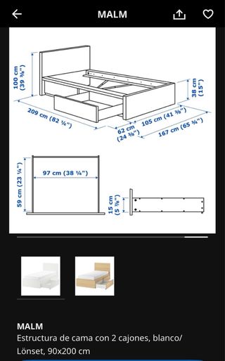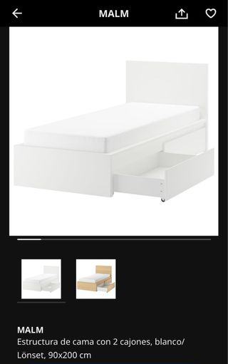 Estructura de cama Malm de Ikea con dos cajones. Ideal para optimizar el espacio. - Medidas: 90x200 cm. - Incluye somier Lönset. No tengo fotos porque la tengo desmontada. Se uso 2 veces.