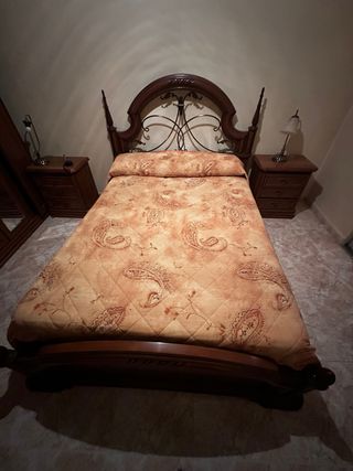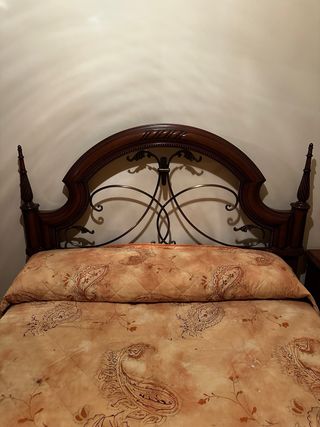 Elegante cama de matrimonio con un diseño clásico y robusto. Combina la calidez de la madera con detalles metálicos. - Estructura principal de madera. - Cabecero con detalles ornamentales en metal. - Incluye base tapizada. - Diseño de estilo clásico. Colchon y almohada incluido Precio negociable