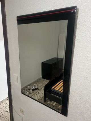 Mueble de dormitorio de color negro brillante con detalles rojos. - Dos mesitas de noche con cajones con tiradores rojos. 50cm de alto x 43 de fondo. - Cabecero de cama. - cómoda con 3 cajones. (90x 42x 100) - Espejo para la cómoda (90x60) - Armario doble con 4 puertas y cajones (220x 200x 50 - Diseño moderno y elegante. - No incluye somier. - A recoger en benidorm centro. - El armario ya se encuentra desmontado.