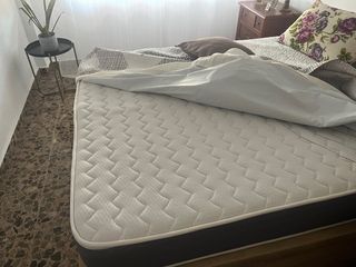 Se vende conjunto de colchón y somier de 135x180 cm. El colchón tiene un tejido con Aloe Vera y está perfectamente, únicamente tiene algunas manchas del uso que limpiándolo y con una funda queda como nuevo. El somier incluye las patas