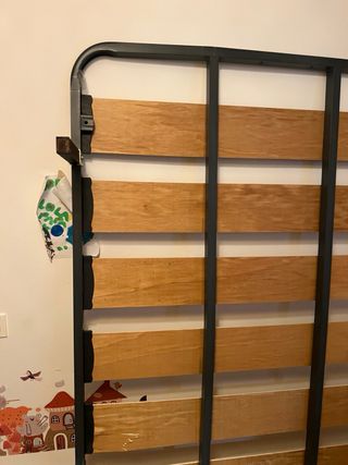 Base de cama de 135x180 cm con estructura metálica y láminas de madera. (una barra de madera con raja ). Las patas de pueden quitar y poner - Diseño moderno y funcional. - Fácil de integrar en cualquier dormitorio.