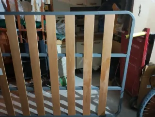 Somier de 90x190 cm con estructura metálica y láminas de madera. - Diseño moderno y funcional. - Base resistente para colchón. Le falta una de las patas se puede poner a parte, a parte de eso el somier esta perfecto tanto de tablas como de estructura.
