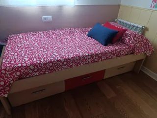 Cama individual con espacio de almacenamiento.Medidas 97 de ancho por 200 cm de largo.Somier 190 por 90. - Tres cajones integrados debajo de la cama. - Estructura de madera. Somier metálico.Se regala colchón A desmontar por el comprador. Tiene algún despertfecto en melanina lateral, poco visible y reparable con cinta adhesiva al calor.