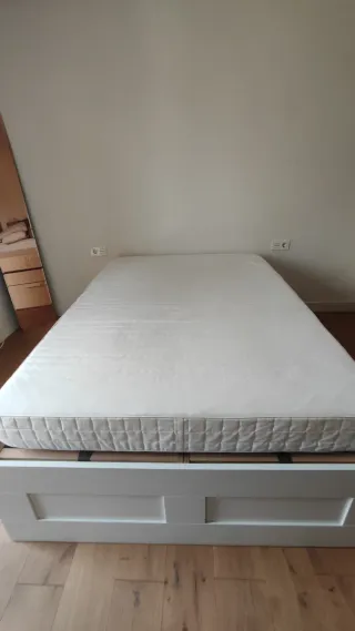 Cama Brimnes de Ikea (140x200 cm) con cajones, muy práctica para almacenaje. Después de 5 años de uso, la cama chirría bastante, por lo que es ideal para quien pueda o quiera arreglarla o no le moleste el ruido. El bastidor y los cajones presentan marcas y arañazos por el uso. En uno de los cajones, el fondo está algo hundido. Básicamente la regalo; los 50 € son más que nada por el somier y el colchón. El somier es ajustable, se puede regular la firmeza. Altura de la estructura: 47,5cm Altura colchón: aprox. 17cm Desmontaje y recogida a cargo del comprador.