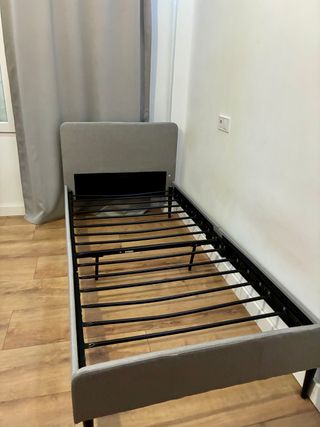 Cama individual de 90 x 200 cm con somier. - Estructura de tela gris. - Base de listones metálicos. Ha sido utilizada solo durante pocos meses, por lo que se encuentra casi como nueva. Ideal para dormitorio individual, habitación juvenil o de invitados