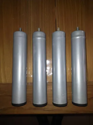 Juego de cuatro patas redondas para somier. Color metal. - Medida: 25 cm de largo. - Base de goma negra. - Rosca metálica para fijación.