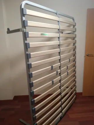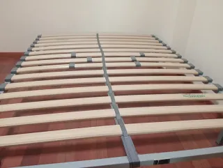 Somier de láminas para cama de matrimonio. - Medidas: 1,35 metros de ancho por 1,90 metros de largo. - Estructura de madera y metal. Posibilidad de añadir el colchón a la venta.
