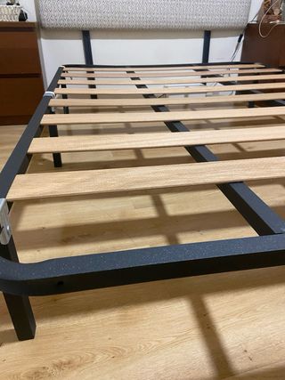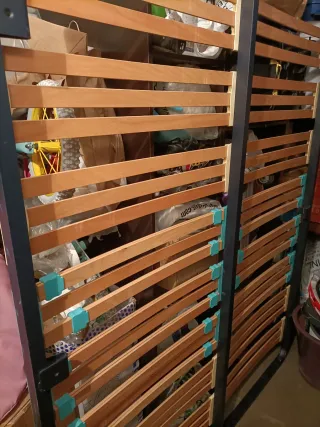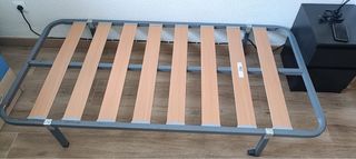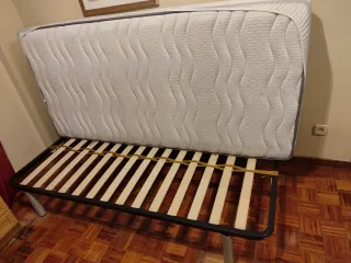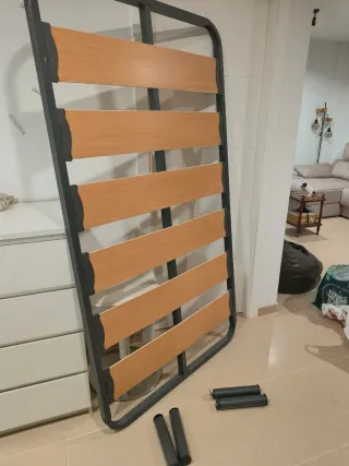 Se vende somier de láminas de 190x90 cm con patas, junto con un colchón. - Estructura metálica. - Láminas de madera. - Color negro y gris.
