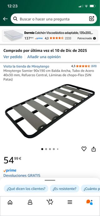 Somier de la marca Miroytengo, con medidas de 90x190 cm. Ideal para tu descanso. - Estructura de tubo de acero. - Láminas de chopo-Flex. comprado por Amazon mes de diciembre 2025. no nos cuadran las medidas