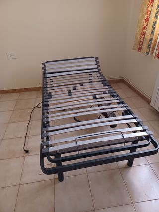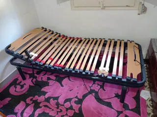 Somier eléctrico articulado de la parte superior e inferior en buen estado. Ideal para un descanso cómodo y adaptable. - Estructura metálica robusta. - Láminas de madera. - Fácil de montar. - Con patas fijas regulables. - Más una barandilla opcional.